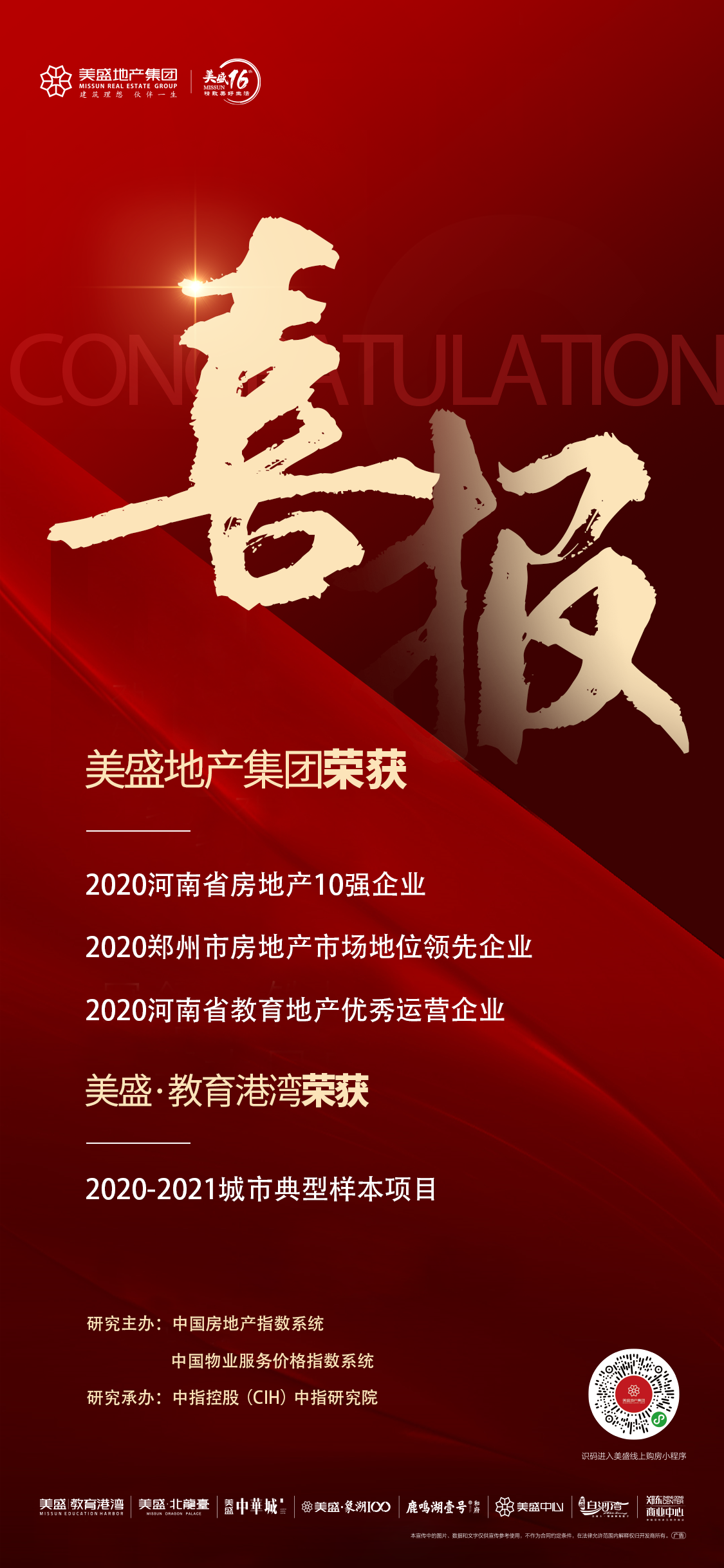 其每屆評(píng)選都引領(lǐng)地產(chǎn)行業(yè)前沿和市場(chǎng)趨勢(shì),挖掘行業(yè)優(yōu)秀品牌,已成為業(yè)內(nèi)最受關(guān)注、最有影響力的年度盛會(huì)之一。此次評(píng)選中,美盛地產(chǎn)集團(tuán)榮膺“2020河南省房地產(chǎn)10強(qiáng)企業(yè)”、“2020鄭州市房地產(chǎn)市場(chǎng)地位領(lǐng)先企業(yè)”“2020河南省教育地產(chǎn)優(yōu)秀運(yùn)營(yíng)企業(yè)”等多項(xiàng)殊榮,其中美盛·教育港灣在諸多經(jīng)典佳作中脫穎而出,榮膺“2020-2021城市典型樣本項(xiàng)目”。