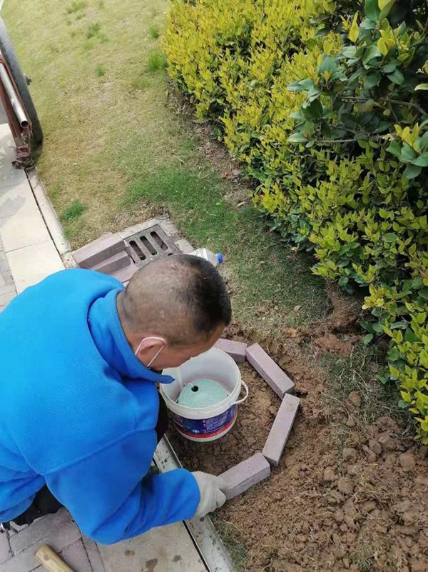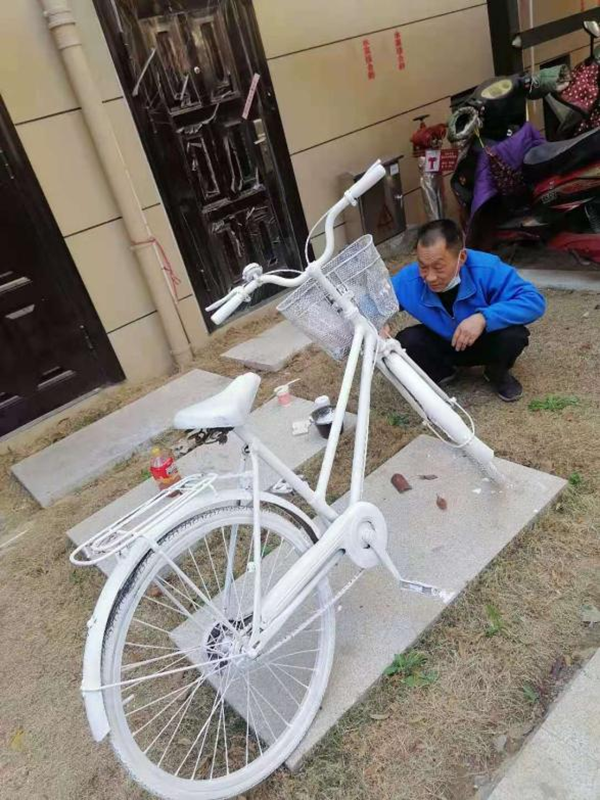 在項目確定方案后,王建功大哥主動請纓,為我們提升措施貢獻自己的一份力量。他積極收集相關的材料,為自行車刷漆,協助環境主管對自行車安裝裝飾花卉,并截取鋼筋對景觀的自行車進行固定;園區的綠化取水口處,針對不同的取水口位置,對取水口周邊灌注水泥,并在周邊增加磚塊造型;小區南門涌泉的水泥地面,則先在周邊鋪設磚塊,擋住泥土,然后用水泥將地面鋪平,再刷上綠漆。