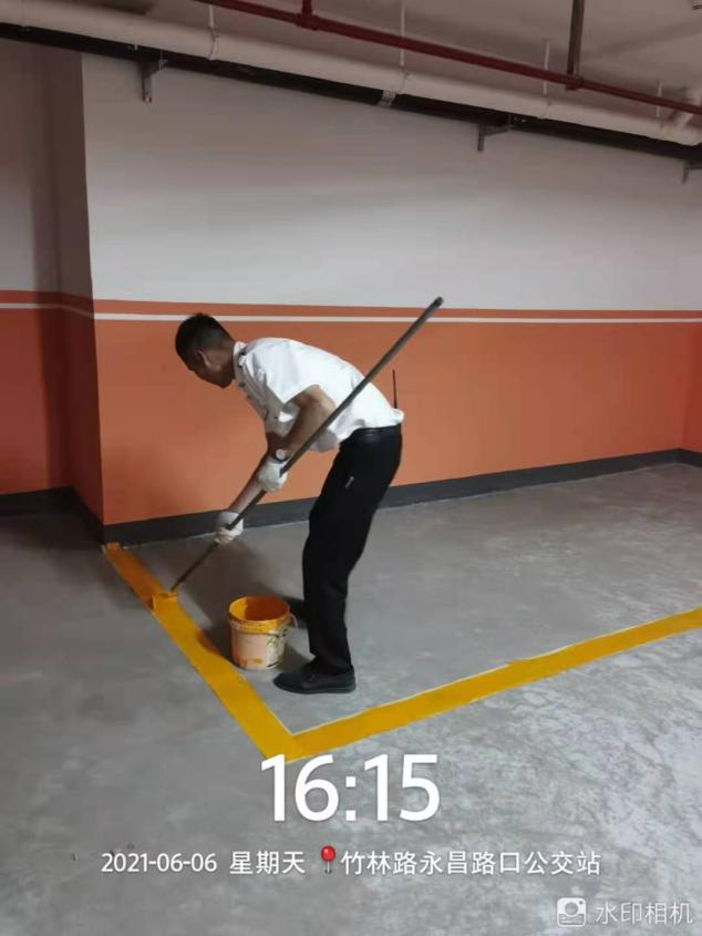 悅府小區(qū)高層負一層作為非機動車停放區(qū),地面未設置停車標線,在項目確定要在負一層設置停車標線之后,王志輝主動請纓,承擔起負一層標線的劃設工作,他利用班余時間,對負一層停放區(qū)域規(guī)劃、地面清理、調(diào)漆、劃線等,在他的帶領下,負一層停放區(qū)域劃線圓滿完成,并取得良好的效果。